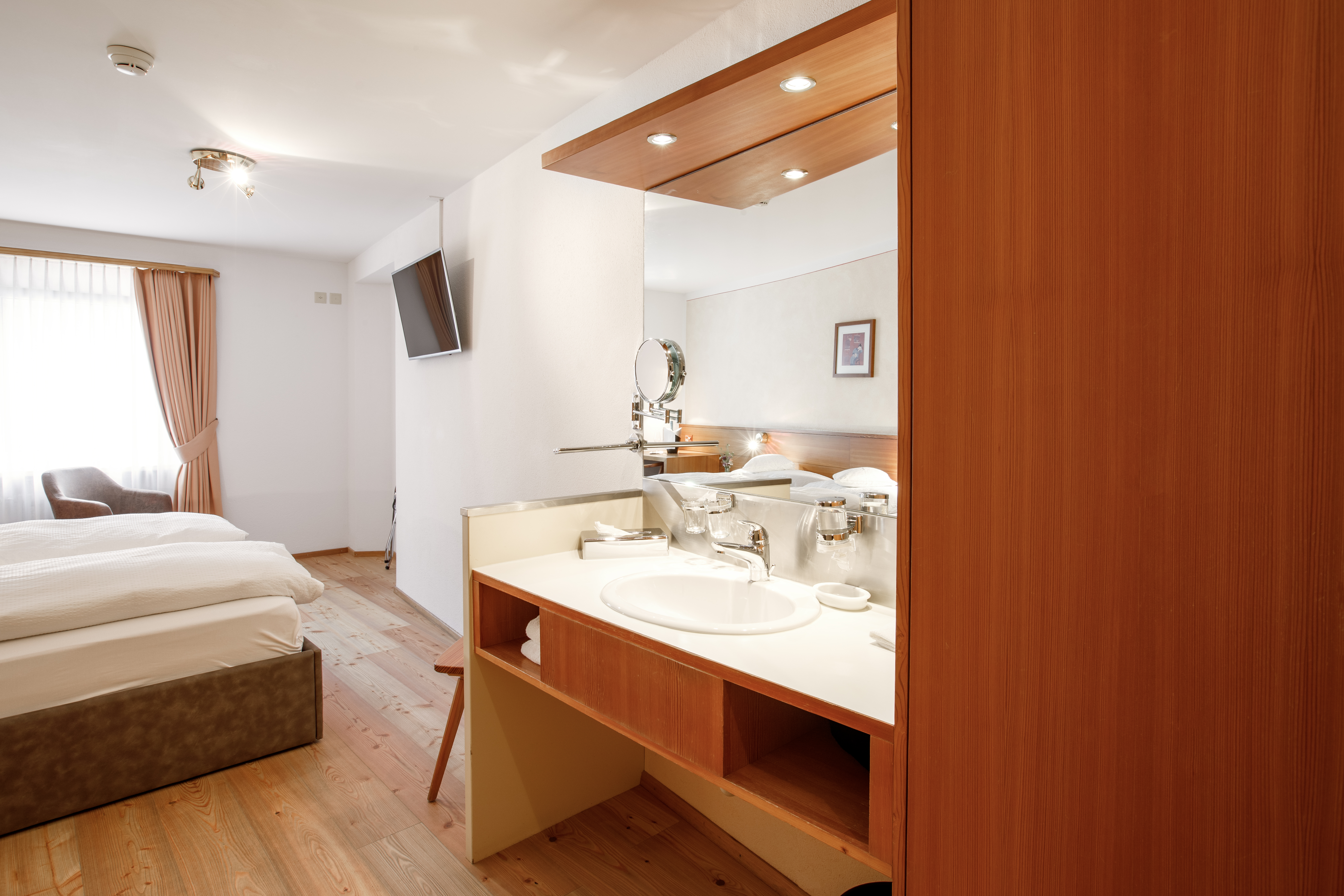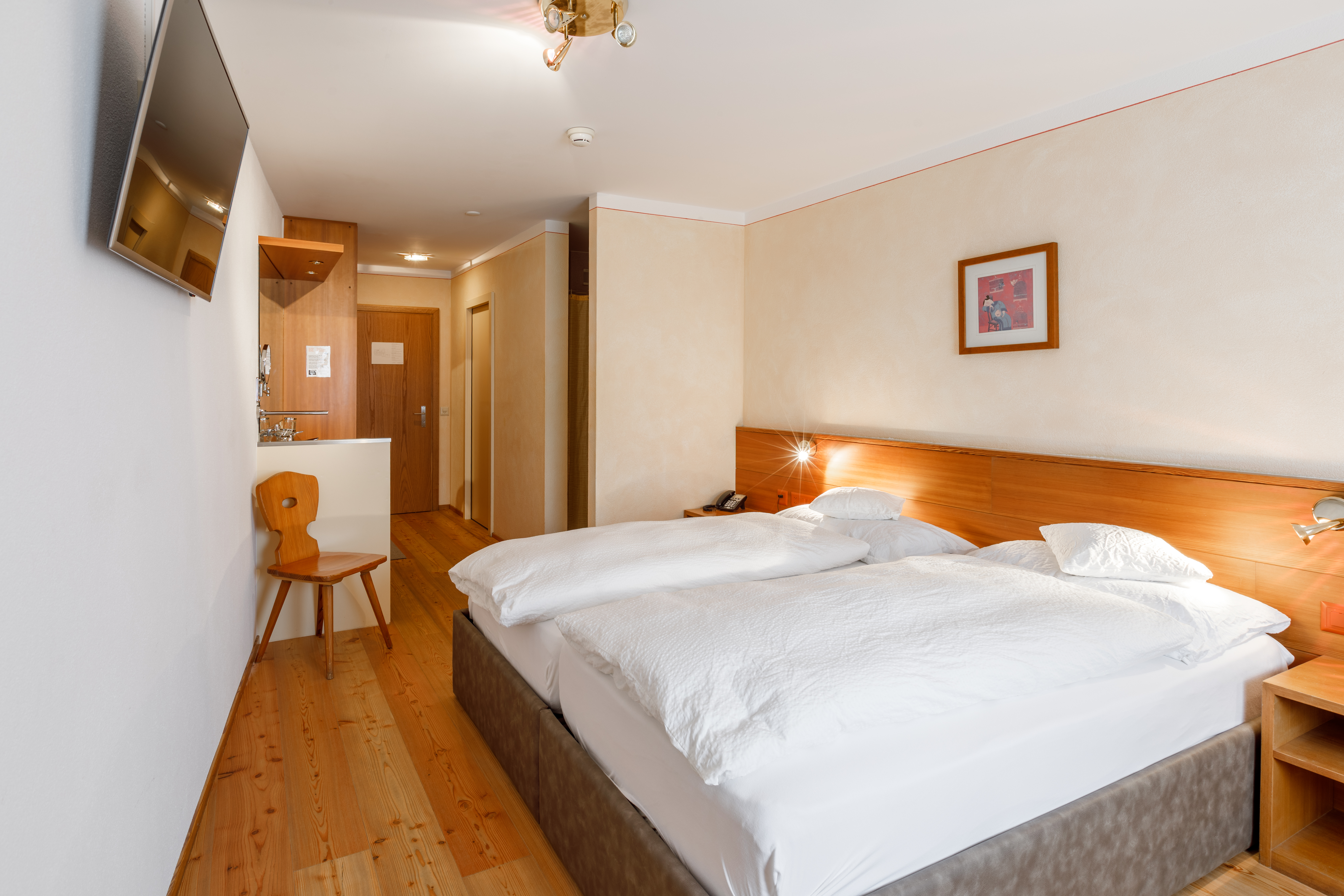 Camere spaziose con colori moderni e mobili in larice. Predisposte per 2 adulti e 1 bambino.