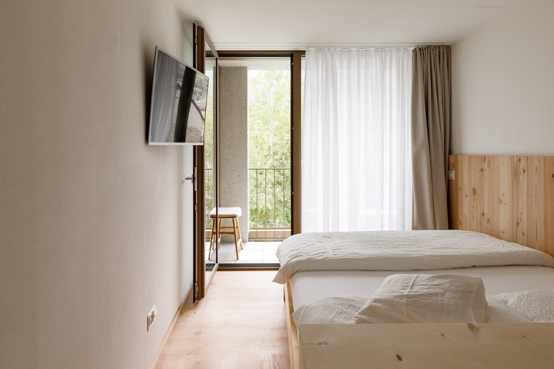 Camera luminosa con balcone, vista giardino.